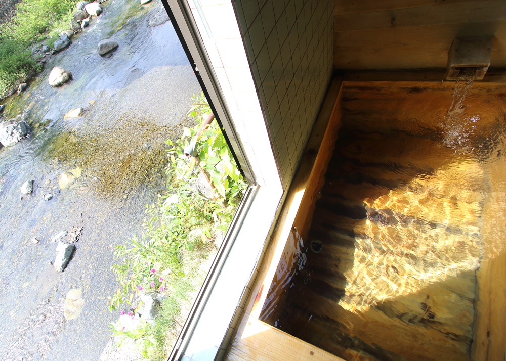 お部屋、浴室の湯船からは檜枝岐川の川面を眺めることができ、